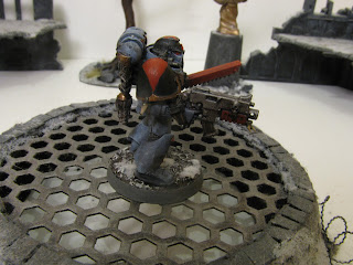 As can be seen here, the model's left arm is Mk. IV pattern. No great idea behind that, I just had an extra Mk.IV arm lying around. I imagine his armour was damaged during his service to the Watch, and was fitted with an Mk.IV arm that the Inquisition has better access to.